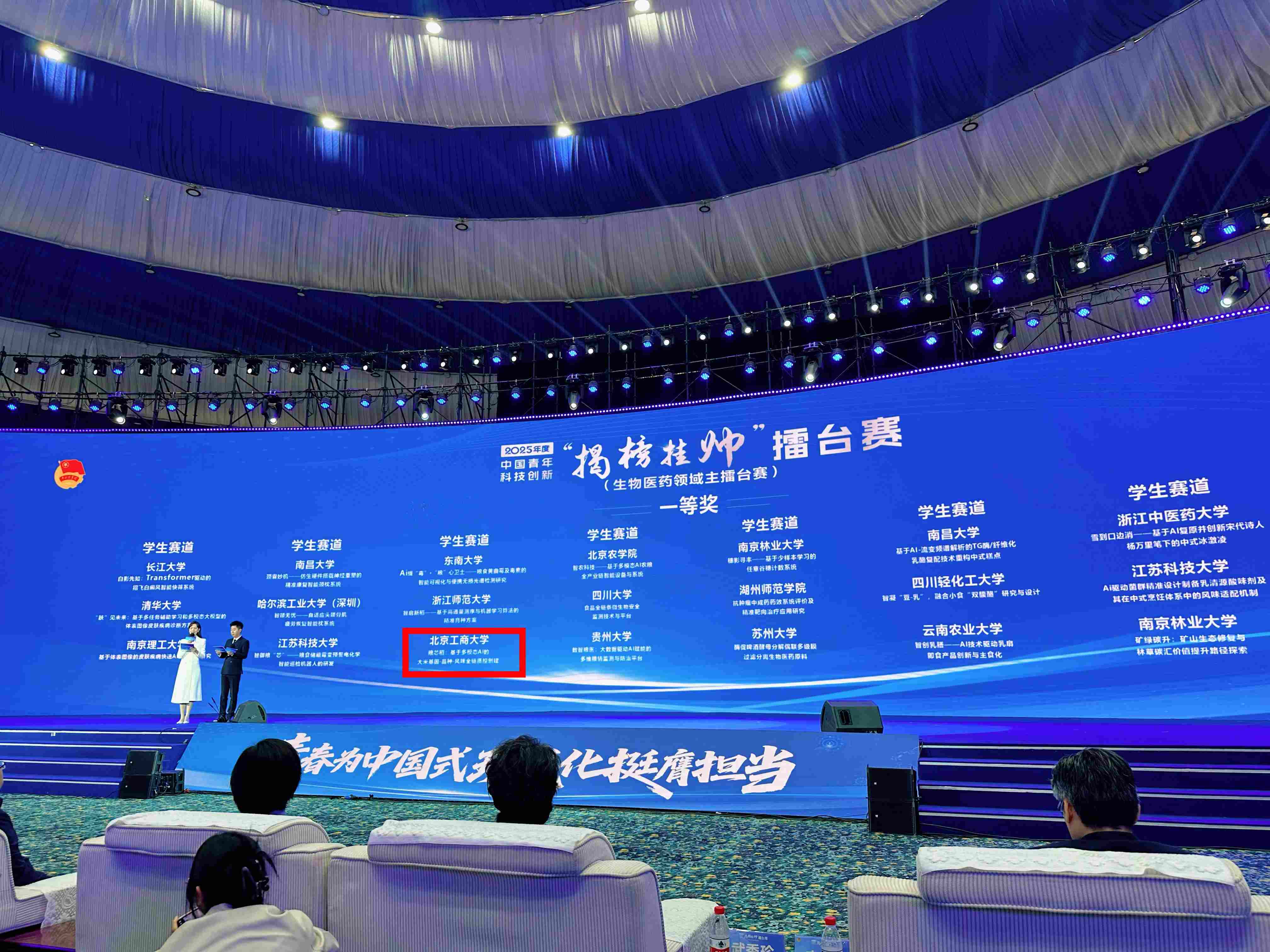 9月27日,在三亞崖州灣科技城舉辦的2025年度中國青年科技創新“揭榜掛帥”擂臺賽“種業科技創新”領域主擂臺賽中,有來自全國的71支青年科創團隊同臺競技,圍繞智慧農業、基因編輯、種質資源創新、水產育種等五大方向展開技術攻堅。我校團隊憑借卓越表現,一舉摘得擂主桂冠,并在頒獎典禮上作為擂主學生代表進行路演展示,向全國展現北工商智慧!
