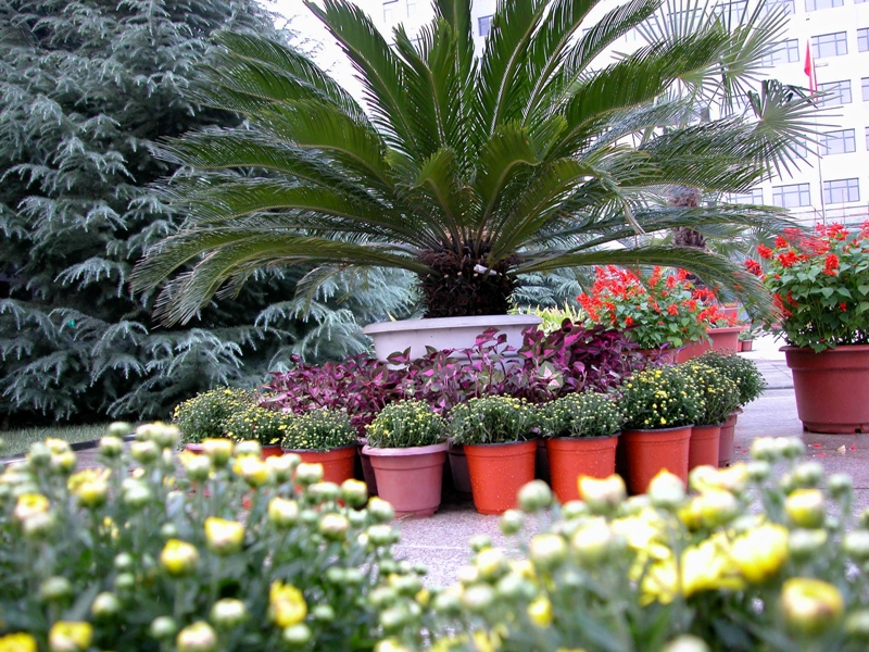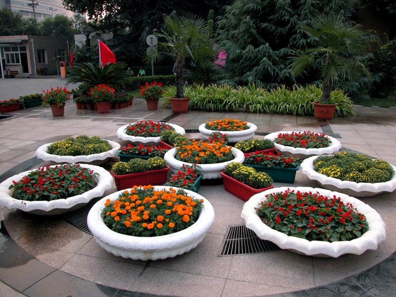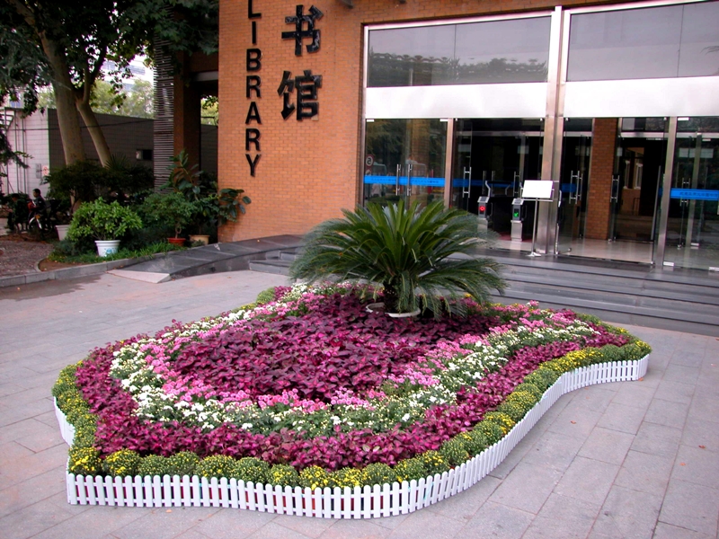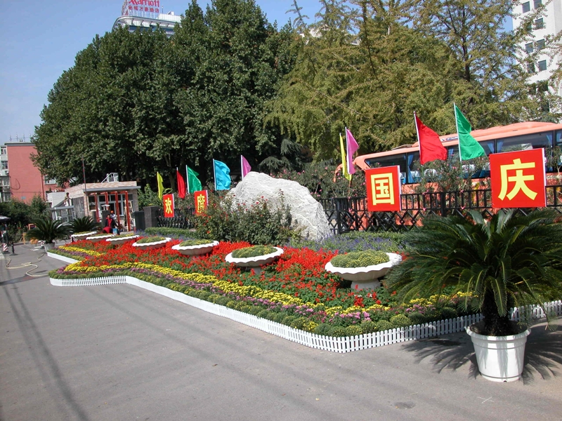物業(yè)中心的綠化師傅們精心培育國慶用鮮花22000盆,阜成路校區(qū)布擺大小花壇42個,其中重要地點主花壇9個。良鄉(xiāng)校區(qū)準備各種國慶用的盆花11000盆,布置花壇5個。綠化師傅發(fā)揮聰明才智,用心設(shè)計花壇造型:阜成路西區(qū)門前的花壇整體造型呈牛頭狀,象征著拼搏、奮進。整個花壇用紅色的一串紅、黃色和紫色的小早菊分層拼圖而成,在“歡度國慶”和迎風(fēng)飄揚的彩旗映襯下,色彩絢麗奪目,吸引了過往行人駐足觀賞;圖書館門前的花壇是盾牌造型,用紫紅色的彩葉草、黃色和粉色的早菊組成,象征著平安、和諧;西區(qū)門前廣場的花壇是風(fēng)車造型,在9個花缽里盛滿了紅色的一串紅、黃色的小早菊、橘黃色的孔雀草,象征著一帆風(fēng)順;良鄉(xiāng)校區(qū)行政樓門前的扇面造型成放射狀,象征著開放和活力,由紅色的火炬雞冠花、黃色的萬壽菊、藍色的豌豆花、粉色的矮牽牛、橘黃色的孔雀草組成。