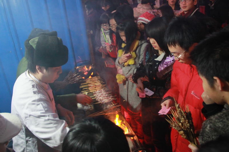 文體館外的小吃街也非?;鸨?。烤串?dāng)偳暗耐瑢W(xué)排成了小長隊,噴香的紅薯、玉米、烤腸、麻辣燙、爆米花、灌腸等小吃吸引了不少同學(xué)駐足品嘗。