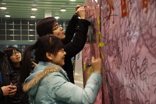 舞會中最令同學(xué)們興奮的就是零點倒計時了。很多同學(xué)表示,今年是他們過得最特殊的一次元旦。此次舞會上還有一大亮點:祝福墻。同學(xué)們在工作人員的指引下,在便利貼上寫了自己的新年寄語,并親自貼到祝福墻上。記者發(fā)現(xiàn),祝福墻上不僅有同學(xué)們的心愿,還有老師們的祝福。