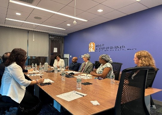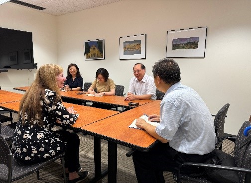 在芝加哥訪問期間,黃先開一行先后訪問了美國伊利諾伊大學芝加哥分校和美國多米尼加大學。在伊利諾伊大學芝加哥分校訪問期間,代表團一行與該校國際部舉行項目會談,雙方回顧了2022年雙方建立校級合作關系以來所開展的交流交往以及合作成果,并就下一階段雙方在碩博層次人才培養、高層次師資交流、科研項目合作以及商科數字化教育平臺建設等內容交換了意見,并達成了初步合作意向。隨后,代表團成員在國際部項目主任Jeff Wang的陪同下參觀了校園的相關教學設施。