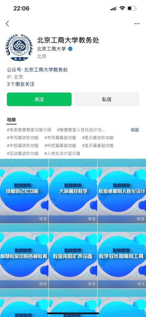 在“北京工商大學教務(wù)處”公眾號上,可以觀看智慧教室各種功能講解短視頻,教師可隨時隨地點擊觀看,方便快捷。視頻是由我校多位教師共同拍攝,身臨其境地體驗了智慧教學的應(yīng)用方法,并站在專任教師的角度講解了智慧教室使用方法。