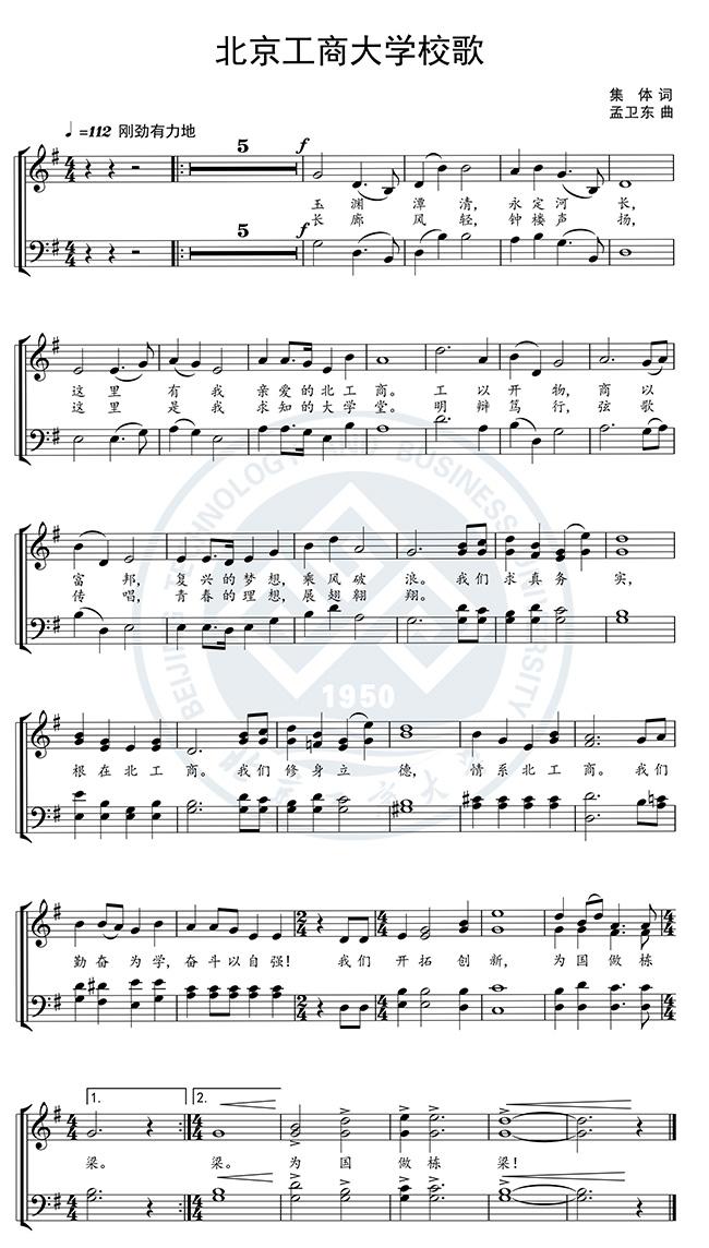 副歌部分突出“求真、立德、勤奮、創新”的校訓,以四重排比闡釋校訓內涵。“修身”取自《禮記·大學》:“古之欲明明德于天下者,先治其國;欲治其國者,先齊其家;欲齊其家者,先修其身。”“為學”取自彭端淑《為學》:“人之為學有難易乎?學之,則難者亦易矣;不學,則易者亦難矣。”在副歌的反復吟誦間,以“求真務實、修身立德、勤奮為學、開拓創新”進一步強化校訓精神,使之成為全體北工商人共同的行為準則和精神堅守。
