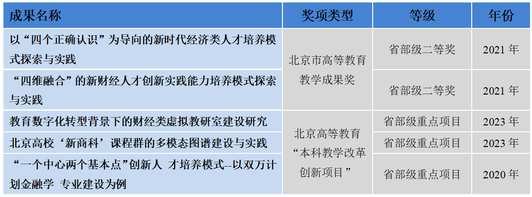 近年來,獲北京市教育教學成果獎2項,獲批教育部首批新文科研究與改革實踐項目1項。北京高等教育“本科教學改革創新項目”立項重點項目3項,北京市教育科學“十四五”規劃重點課題2項、優先關注課題1項,一般和青年專項課題7項。