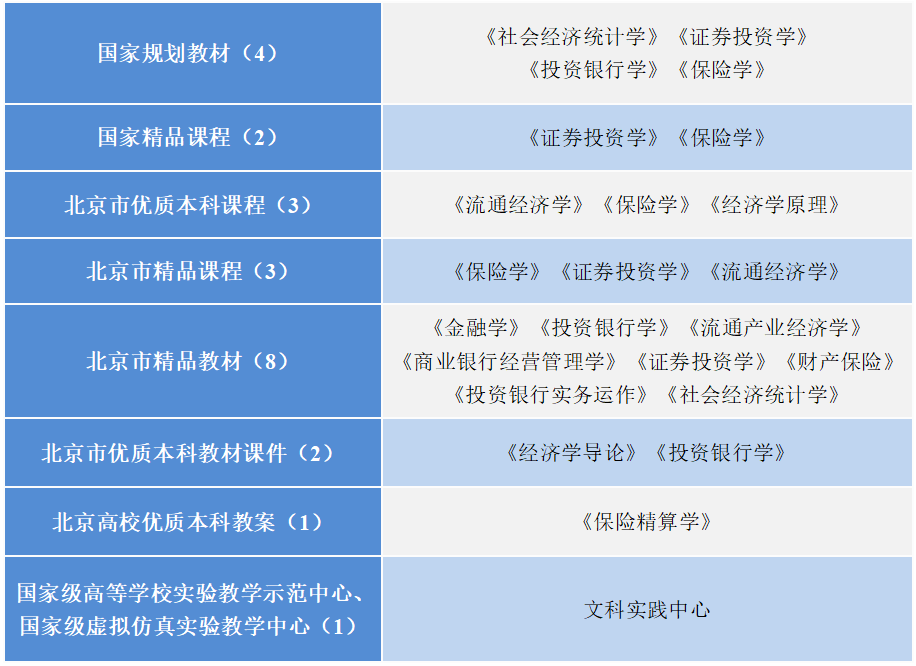 學院不斷加強專業、課程、教材、教學團隊與名師的建設。獲批國家精品課程2門,北京市優質本科課程3門,精品課程3門,4部教材入選教育部“十二五”國家規劃教材。《保險學》《證券投資學》《金融學》等8部教材被評為北京市精品教材。1名教師榮獲“北京市高等學校教學名師獎”,經濟管理實驗教學團隊獲批國家級優秀教學團隊,金融學教學團隊獲批北京市優秀教學團隊。