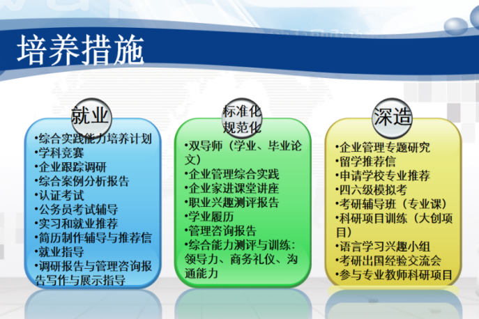 專業優秀師資團隊通過開設管理學、市場營銷學、人力資源管理、戰略管理、跨文化管理、組織理論與設計、供應鏈管理、服務營銷、組織行為學等全英或雙語課程,提升學生的全球化視野和外語溝通交流技能,助力學生出國深造和實現高質量就業。